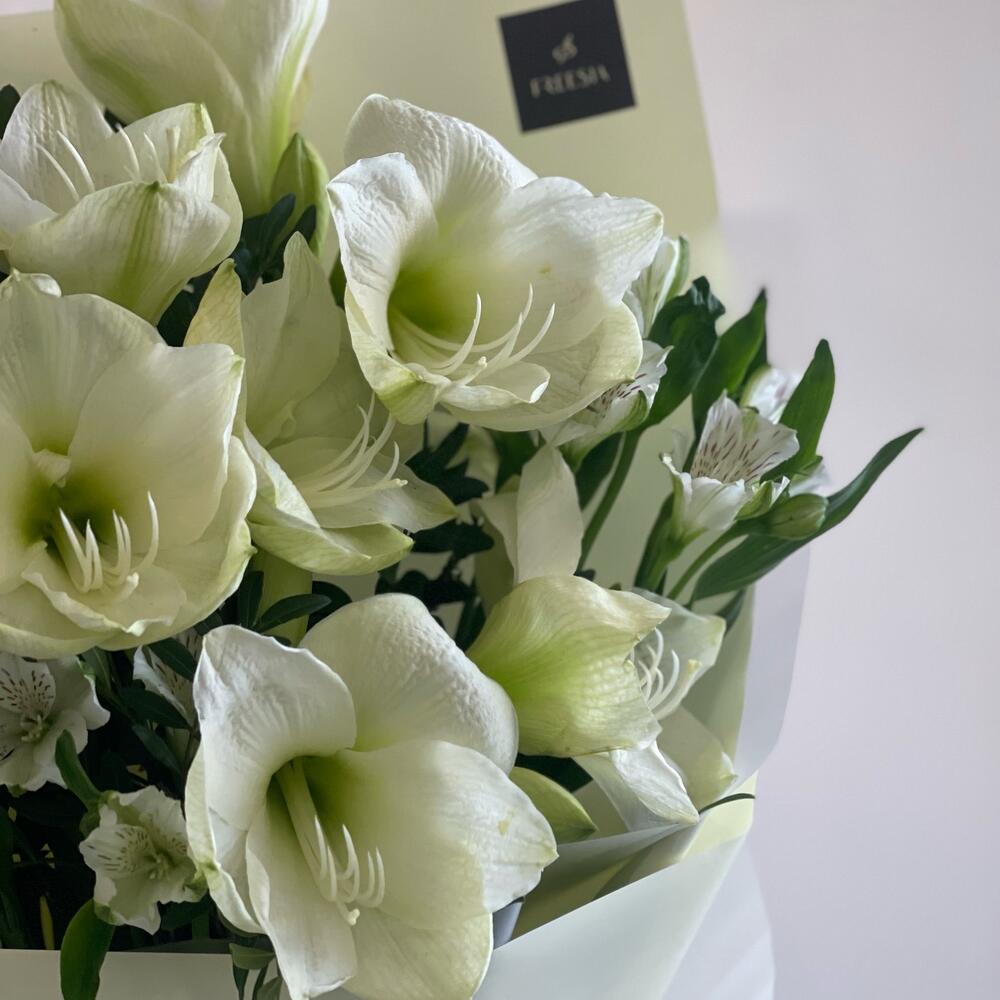 Альстромерия – 2 шт.Фисташка пучок – 2 шт.Дизайнерская упаковка – 1 шт.амариллис микс – 3 шт.