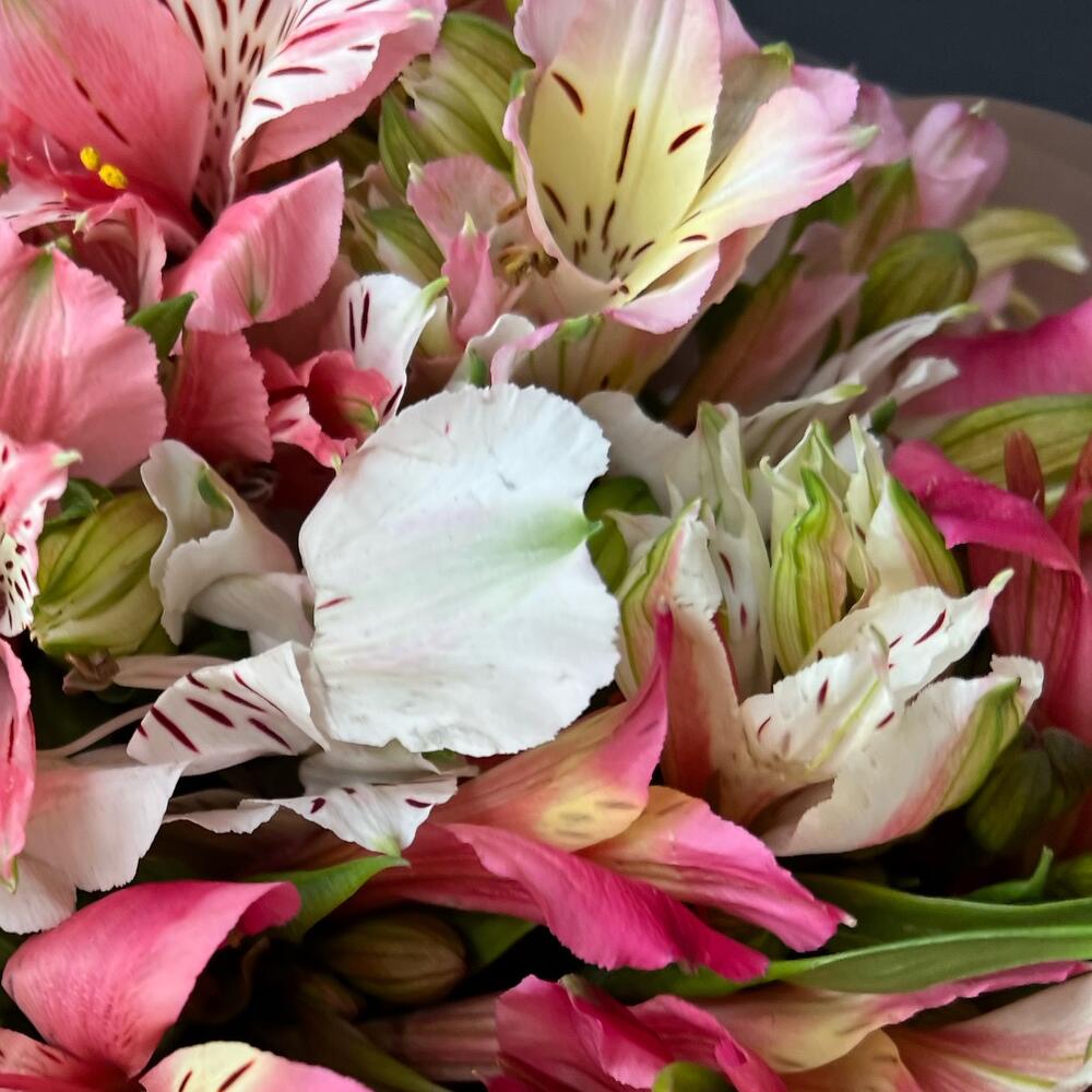 Атласная лента – 1 шт.декоративная упаковка – 1 шт.Альстромерия – 17 шт.
