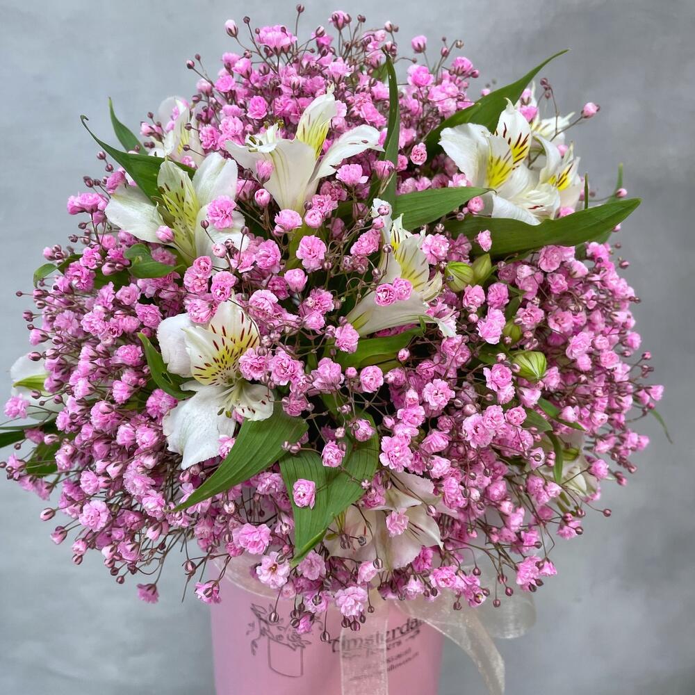 Альстромерия – 5 шт.Гипсофила розовая – 3 шт.Коробка d12 – 1 шт.Оазис – 1 шт.