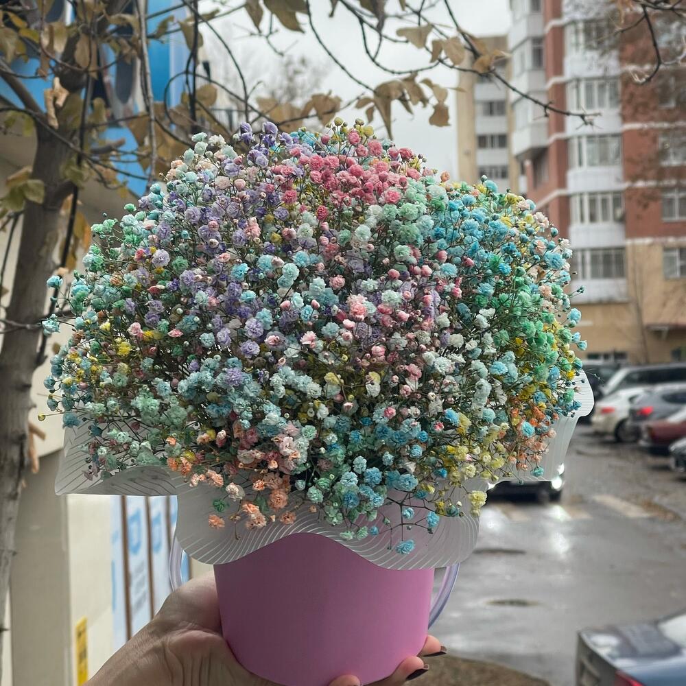 “Сиреневый туман” – композиция из гипсофилы в шляпной коробке