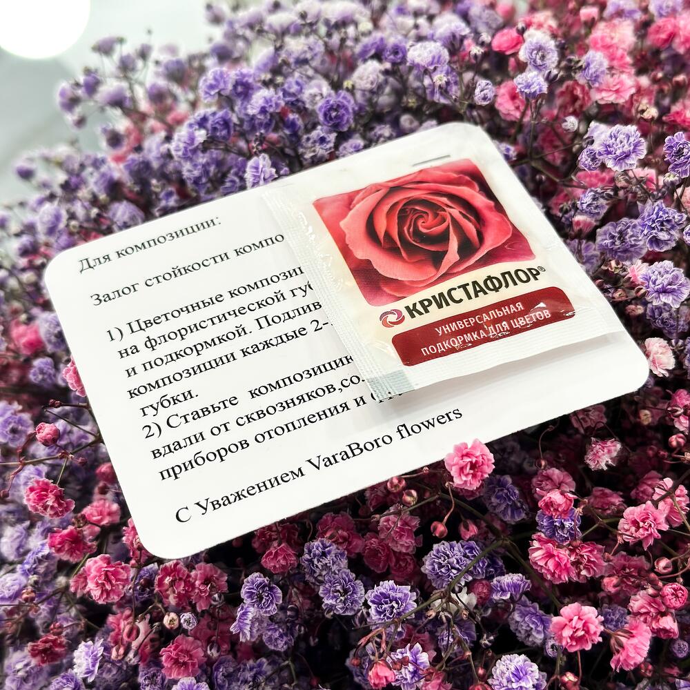 Тишью – 3 шт.Открыточка с вашими пожеланиями – 1 шт.Средство для продления жизни цветов – 1 шт.инструкция по уходу за цветами – 1 шт.гипсофила радужная – 15 шт.шляпная коробка с лентами и оазисом – 1 шт.