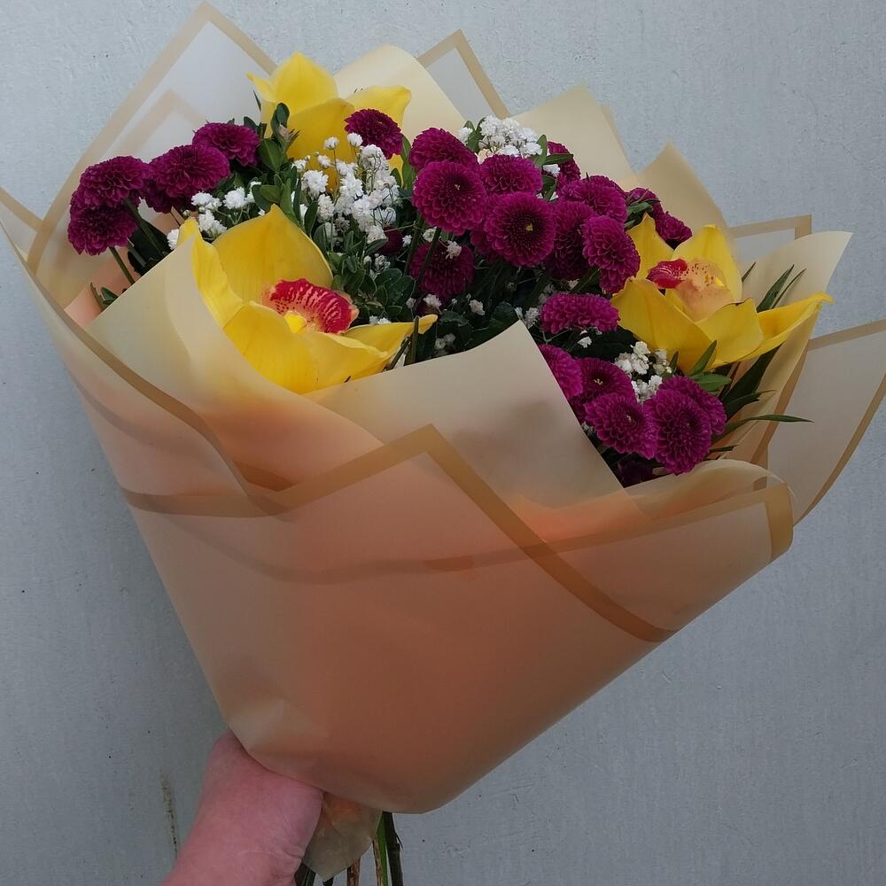 Гипсофила – 1 шт.Сантини – 5 шт.ЦИМБИДИУМ – 3 шт.Упаковка дизайнерская – 8 шт.самшит зелень – 10 шт.