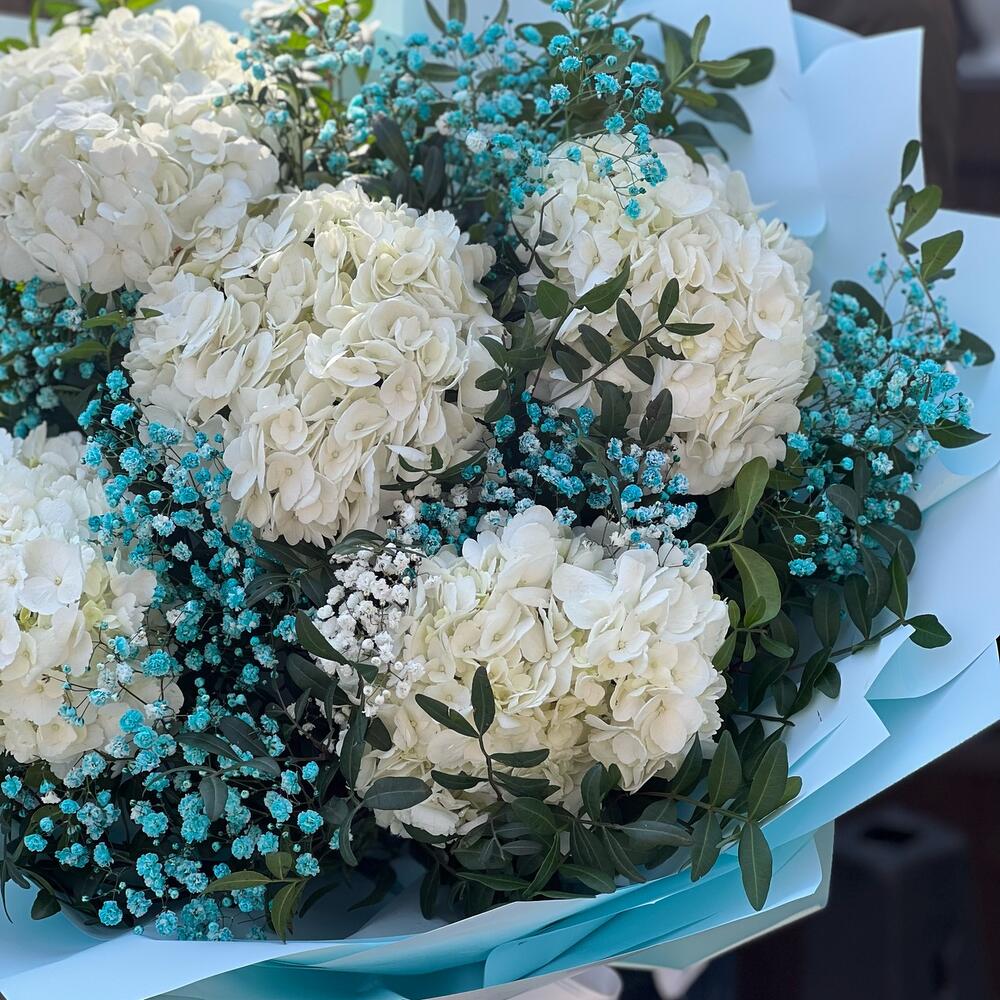 Гортензия – 5 шт. Гипсофила – 5 шт. Фисташка – 10 шт. Упаковка дизайнерская – 8 шт. Лента – 1 шт.