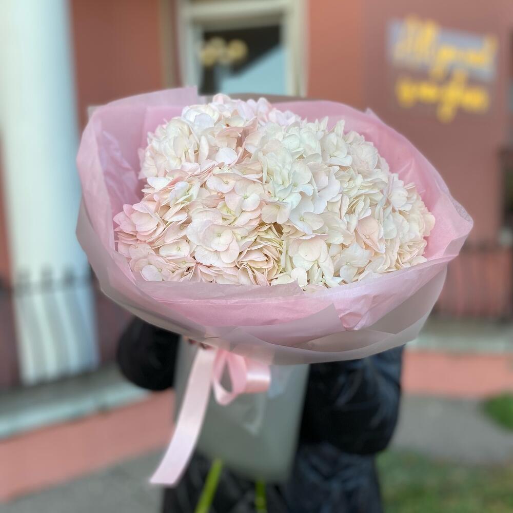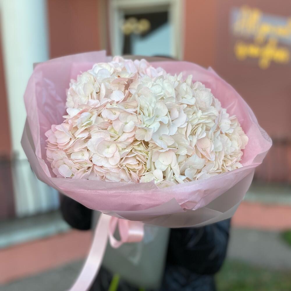 Гортензия – 3 шт. Атласная лента – 1 шт. Тишью – 1 шт. Пленка дизайнерская – 1 шт.