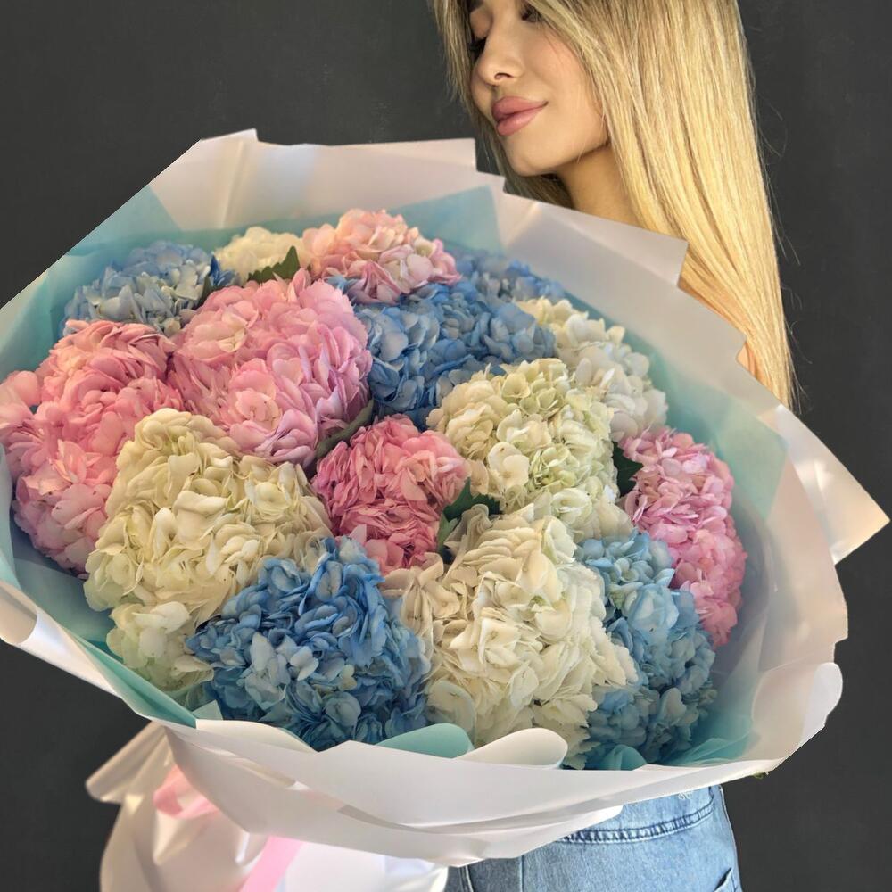 Альстромерии, Гортензии, Кустовые розы, Лизиантусы, Розы, Хризантемы