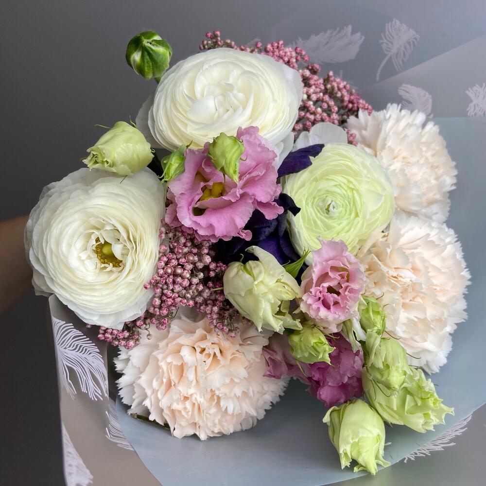 Ранункулюс – 3 шт.Гвоздика одноголовая – 3 шт.Анемон – 1 шт.Лизиантус – 1 шт.озатомнус – 2 шт.Упаковка дизайнерская – 1 шт.