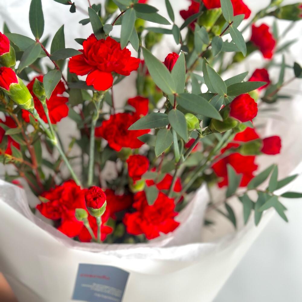 Эвкалипт – 2 шт.Гвоздика кустовая – 9 шт.Упаковка дизайнерская – 1 шт.Открытка – 1 шт.