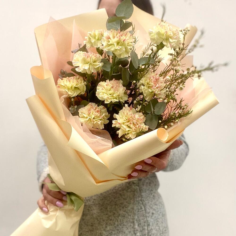 Диантус – 9 шт.Хамелациум – 1 шт.Эвкалипт – 1 шт.Упаковка дизайнерская – 2 шт.Лента – 1 шт.