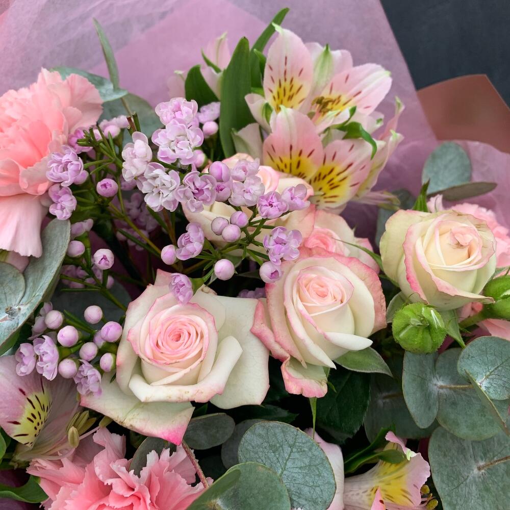 Гвоздика – 3 шт.Альстромерия – 3 шт.Роза кустовая – 1 шт.Ваксфлауэр – 1 шт.Эвкалипт – 2 шт.Упаковка дизайнерская – 2 шт.
