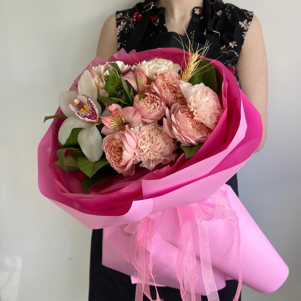 Альстромерия – 1 шт.Орхидея Цимбидиум – 1 шт.Лента атласная – 2 шт.Диантус – 4 шт.Пленка матовая – 6 шт.джульетта – 1 шт.Салал пучок – 1 шт.Пшеница (сухоцвет) – 1 шт.