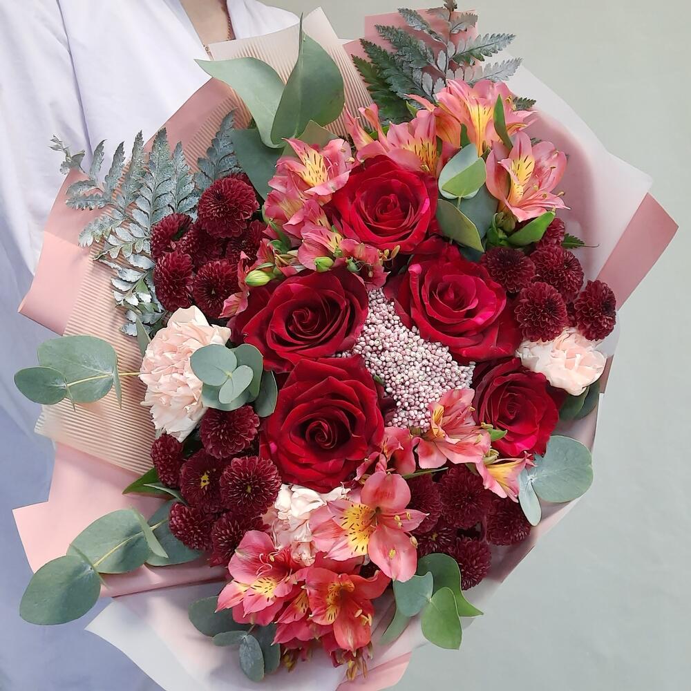 Роза – 5 шт.Альстромерия – 4 шт.Сантини – 4 шт.Диантус – 4 шт.Озотамнус – 1 шт.Эвкалипт – 3 шт.Упаковка дизайнерская – 3 шт.Лента атласная – 1 шт.