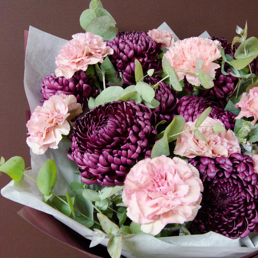 хризантема бигуди – 10 шт. Гвоздика – 9 шт. Эвкалипт – 2 шт. Оформление – 1 шт.