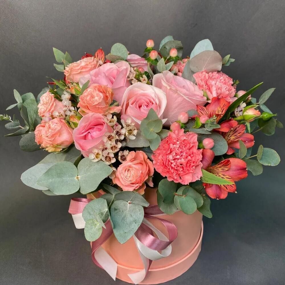 Роза Эквадор – 5 шт.Диантус – 5 шт.Роза кустовая пионовидная – 2 шт.Шляпная коробка с лентами – 1 шт.Альстромерия Микс Европа – 3 шт.Эвкалипт Микс – 3 шт.Ваксфлауэр белый – 1 шт.гиперикум ягоды – 2 шт.