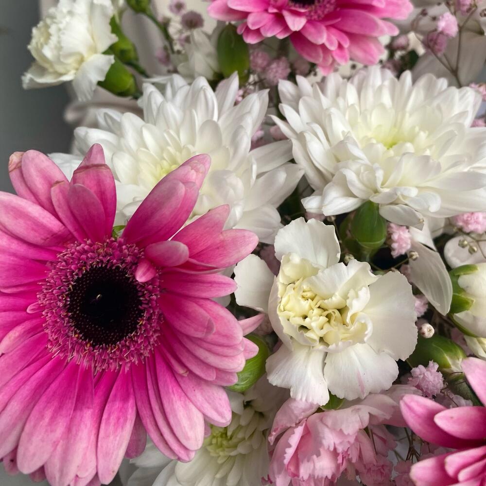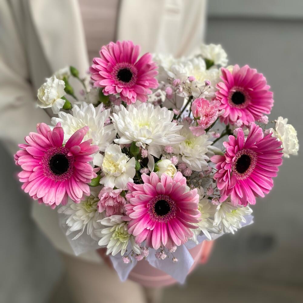 Гермини – 5 шт.Хризантема кустовая – 3 шт.Коробка шляпная – 1 шт.Диантус кустовой – 6 шт.Оазис флористический – 1 шт.