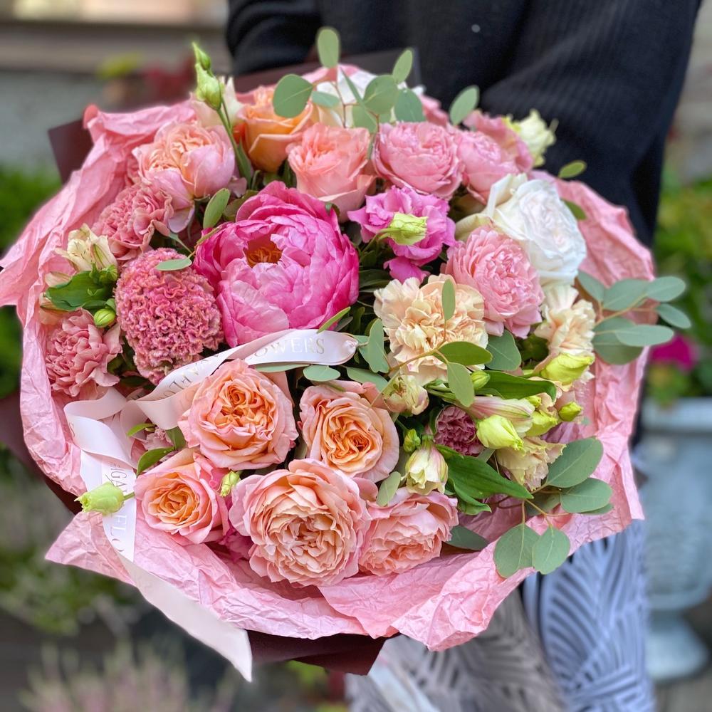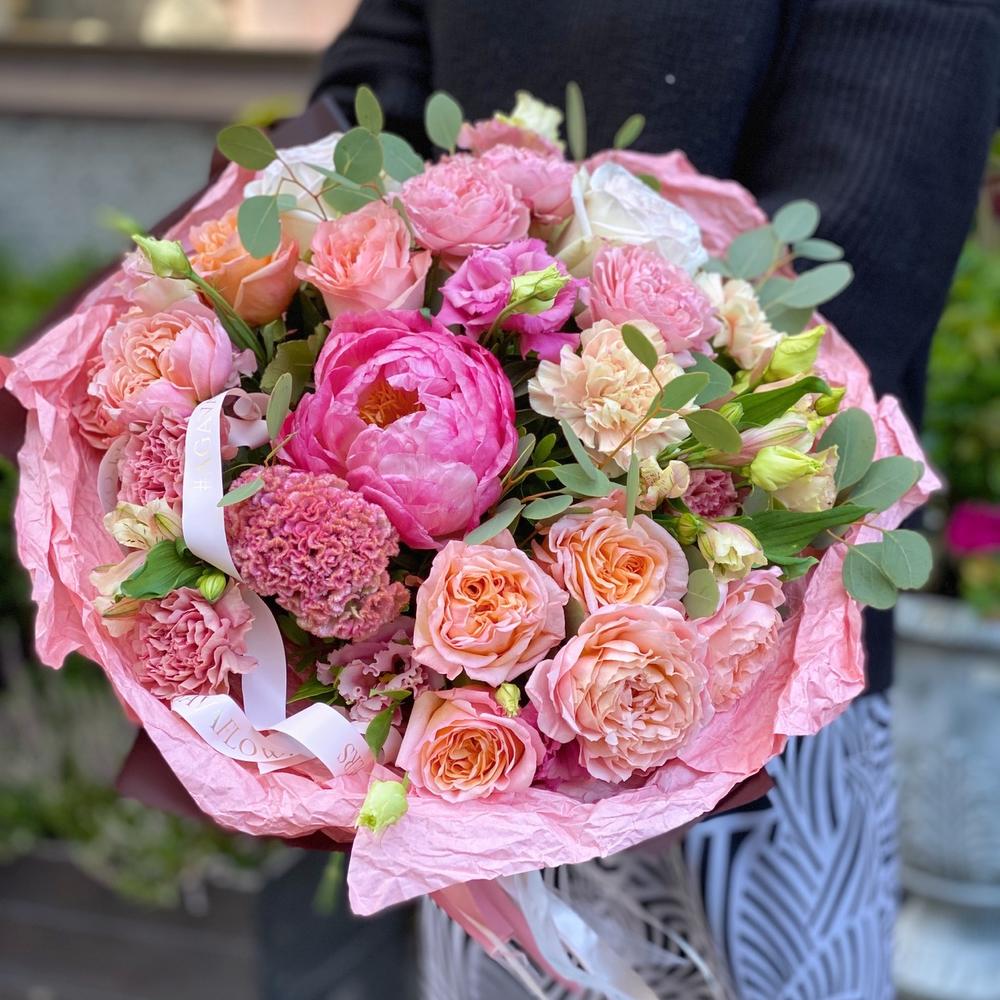 Альстромерия – 3 шт.Лизиантус – 4 шт.Пион – 1 шт.Эвкалипт – 4 шт.Диантус – 7 шт.Роза пионовидная кустовая – 3 шт.Роза пионовидная – 7 шт.Атласная лента – 2 шт.Дизайнерская упаковка – 2 шт.