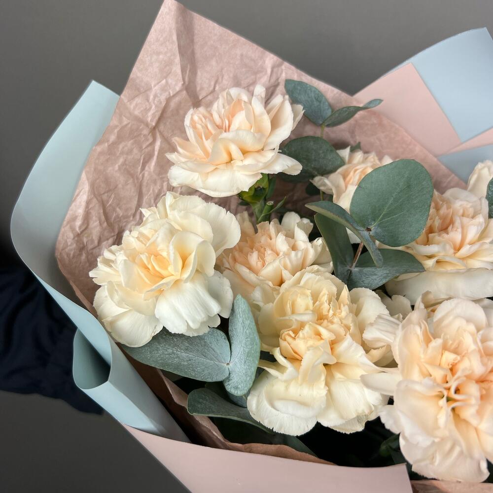 Тишью – 1 шт.Калька – 1 шт.Эвкалипт ценерея – 3 шт.Кремовая гвоздика – 11 шт.