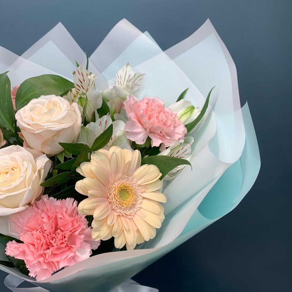 Альстромерия – 1 шт.Гермини – 1 шт.Салал – 1 шт.Диантус – 3 шт.Роза пионовидная кустовая – 1 шт.Фисташка – 3 шт.