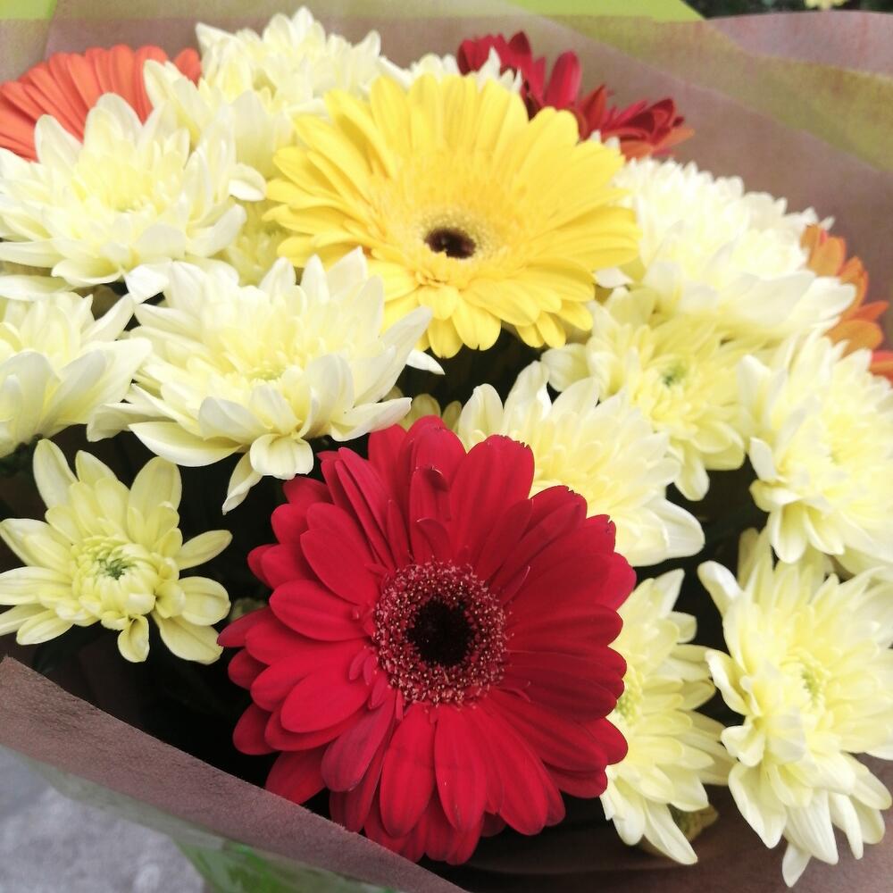 Гербера – 5 шт.Хризантема кустовая – 4 шт.Упаковка – 1 шт.