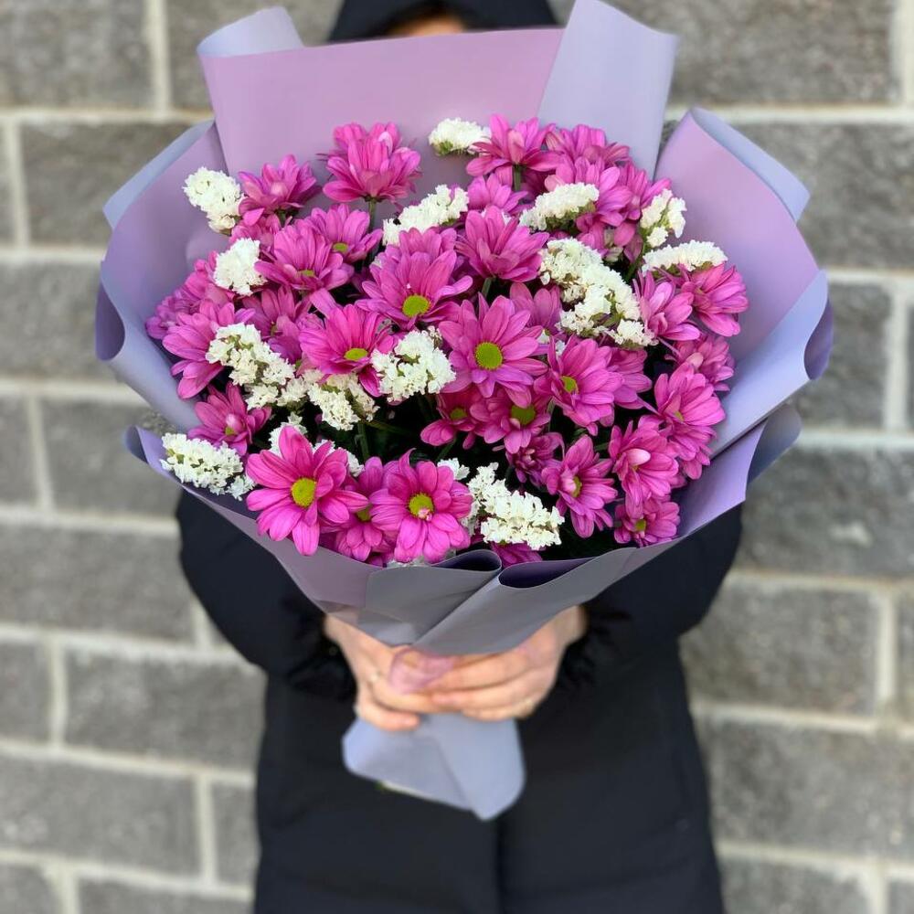 Хризантема кустовая – 7 шт.Статица – 2 шт.Упаковка дизайнерская – 1 шт.Лента атласная – 1 шт.