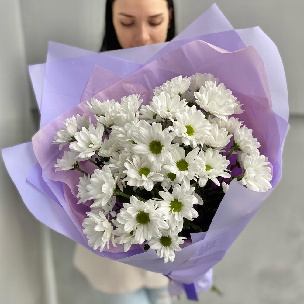 Лента атласная – 1 шт.Упаковка дизайнерская – 1 шт.хризантема кустовая чик – 5 шт.