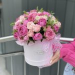 Коробка Валенсия с кустовыми пионовидными розами и эустомой