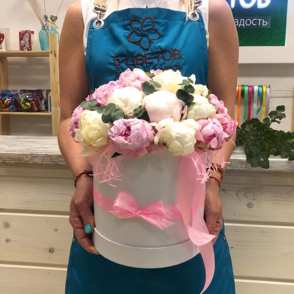 пионы белые – 12 шт.пионы розовые – 13 шт.зелень эвкалипт – 1 шт.шляпная коробка с оазисом – 1 шт.Атласная лента – 1 шт.