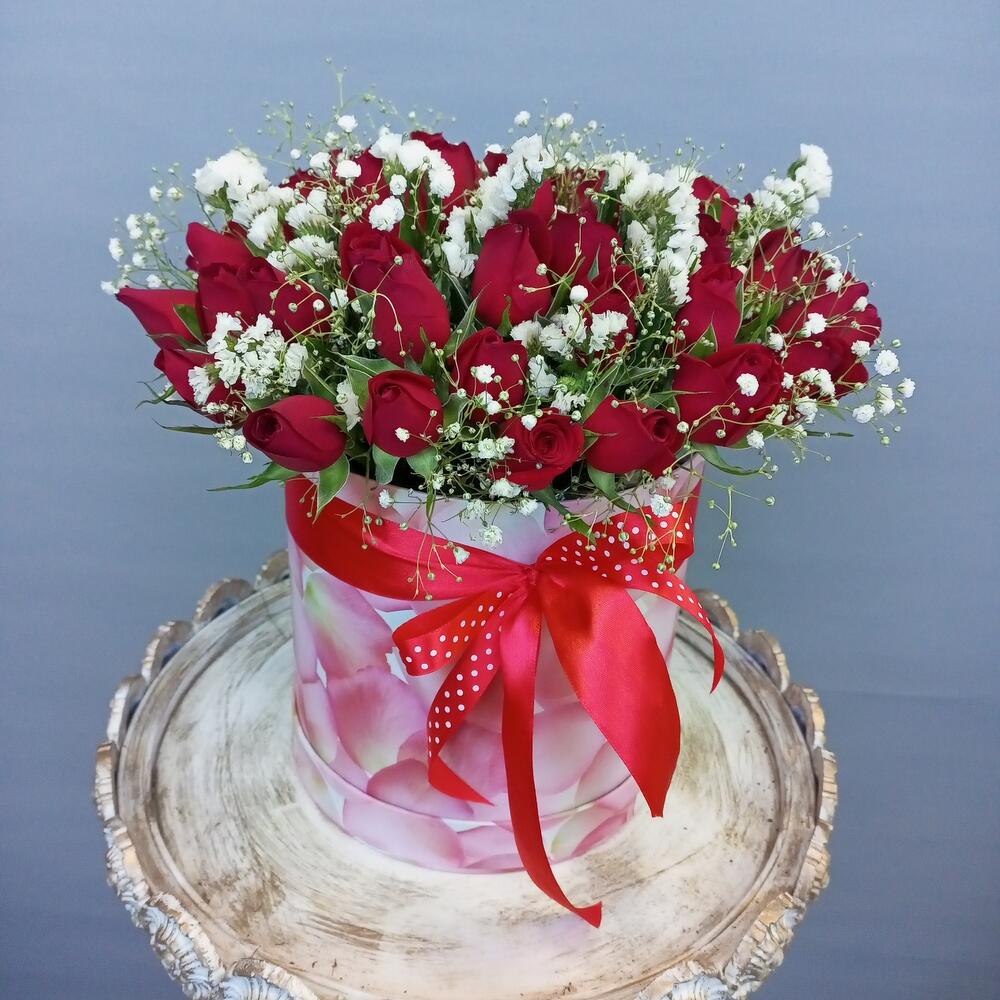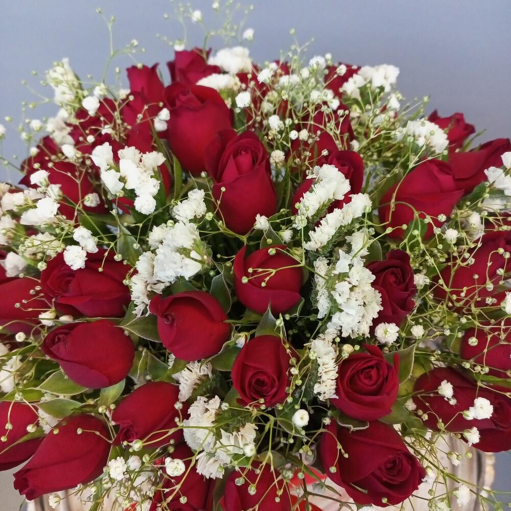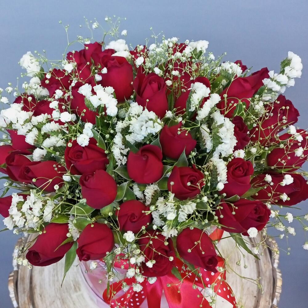 Гипсофила – 3 шт.Статица – 3 шт.Лента атласная – 2 шт.Коробка шляпная – 1 шт.Оазис флористический – 1 шт.роза кения – 51 шт.