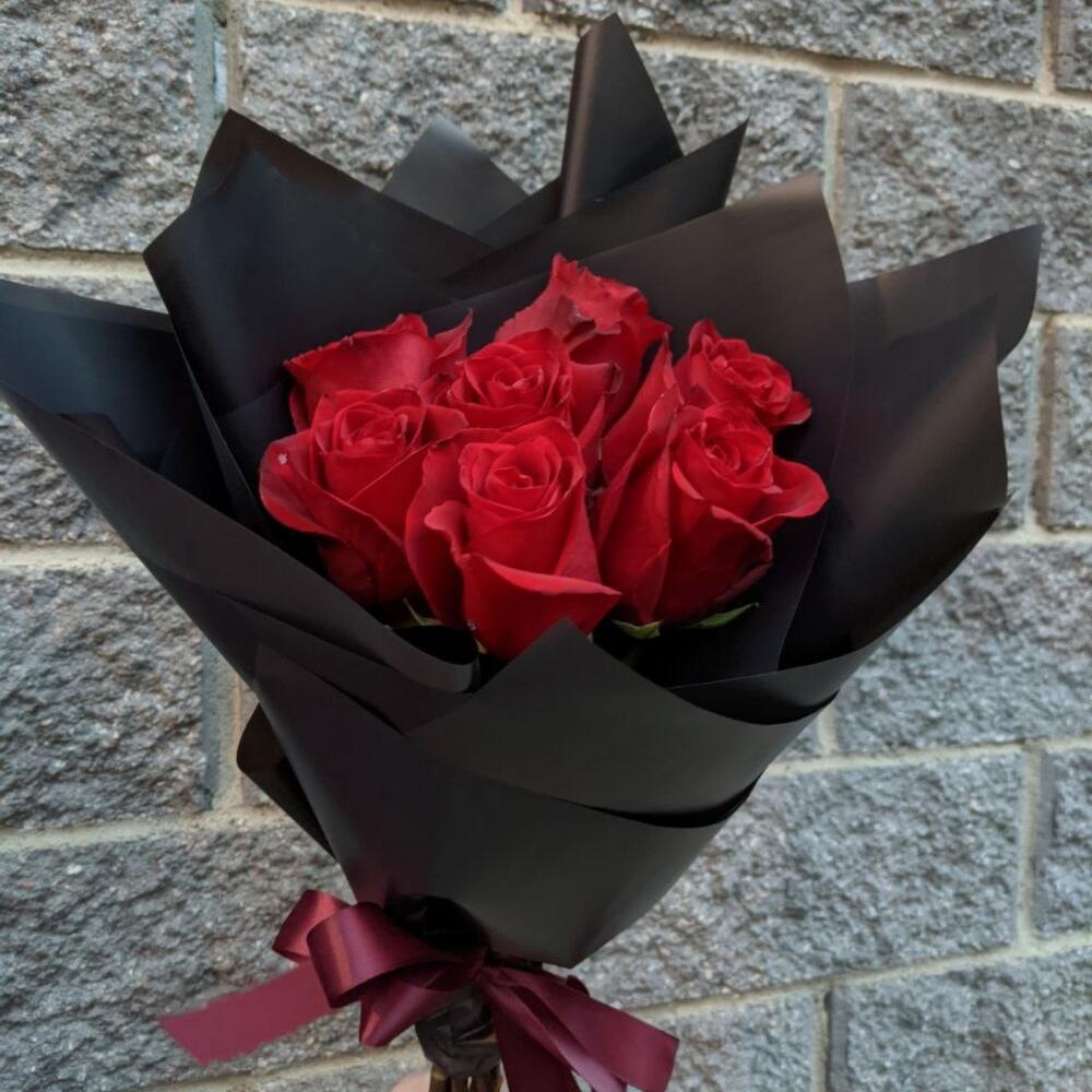 роза эквадор красная 70 см – 7 шт.черная корейская пленка – 2 шт.Атласная лента – 1 шт.