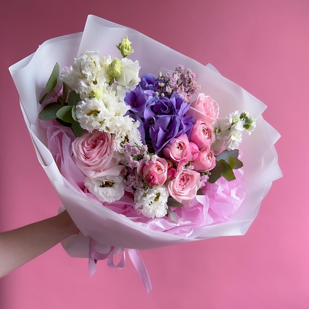 Гортензия – 1 шт.Эвкалипт – 2 шт.Кустовая роза – 1 шт.Хамелациум – 1 шт.Маттиола белая – 1 шт.эустома белая – 2 шт.Дизайнерская упаковка – 1 шт.pink o’hara роза – 3 шт.