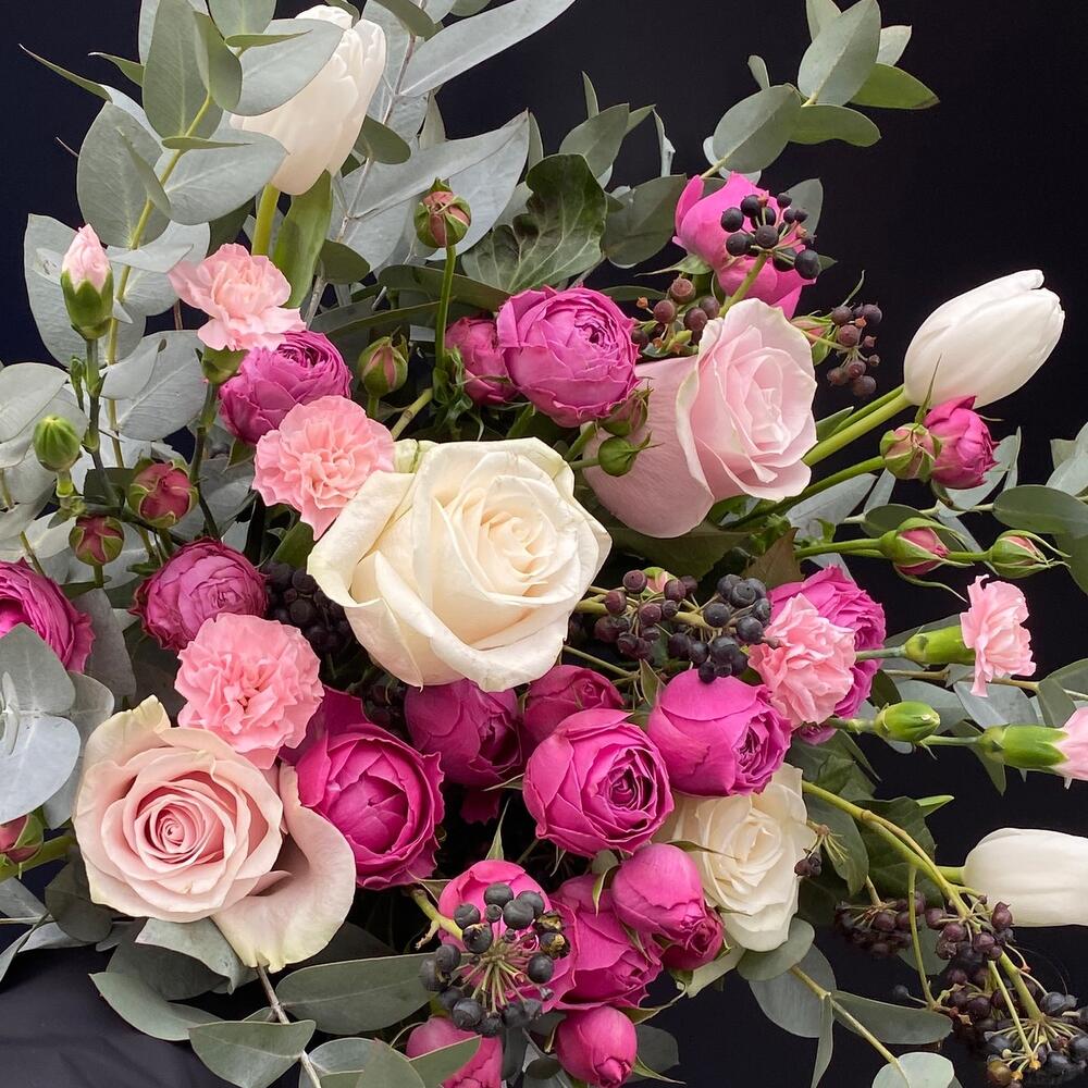 Гвоздики, Лизиантусы, Розы, Тюльпаны