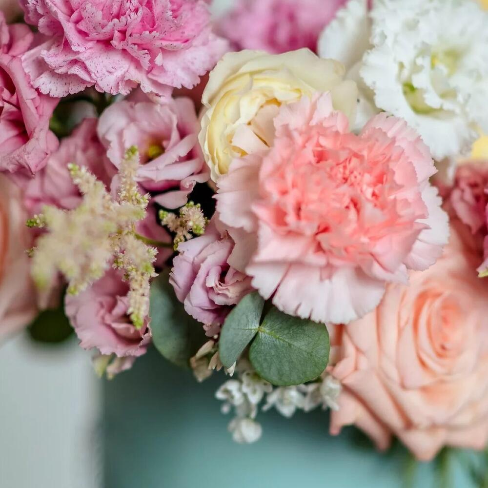 Роза одноголовая – 7 шт.Лизиантус алиса – 4 шт.Диантус – 7 шт.Роза кустовая – 2 шт.ветки эвкалипта – 2 шт.Маттиола – 2 шт.коробка шляпная размер l – 1 шт.
