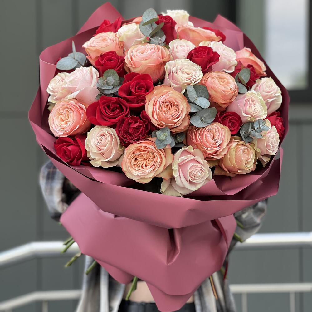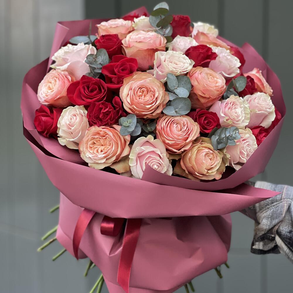 Букет из 3 видов роз и эвкалипта в оформлении!