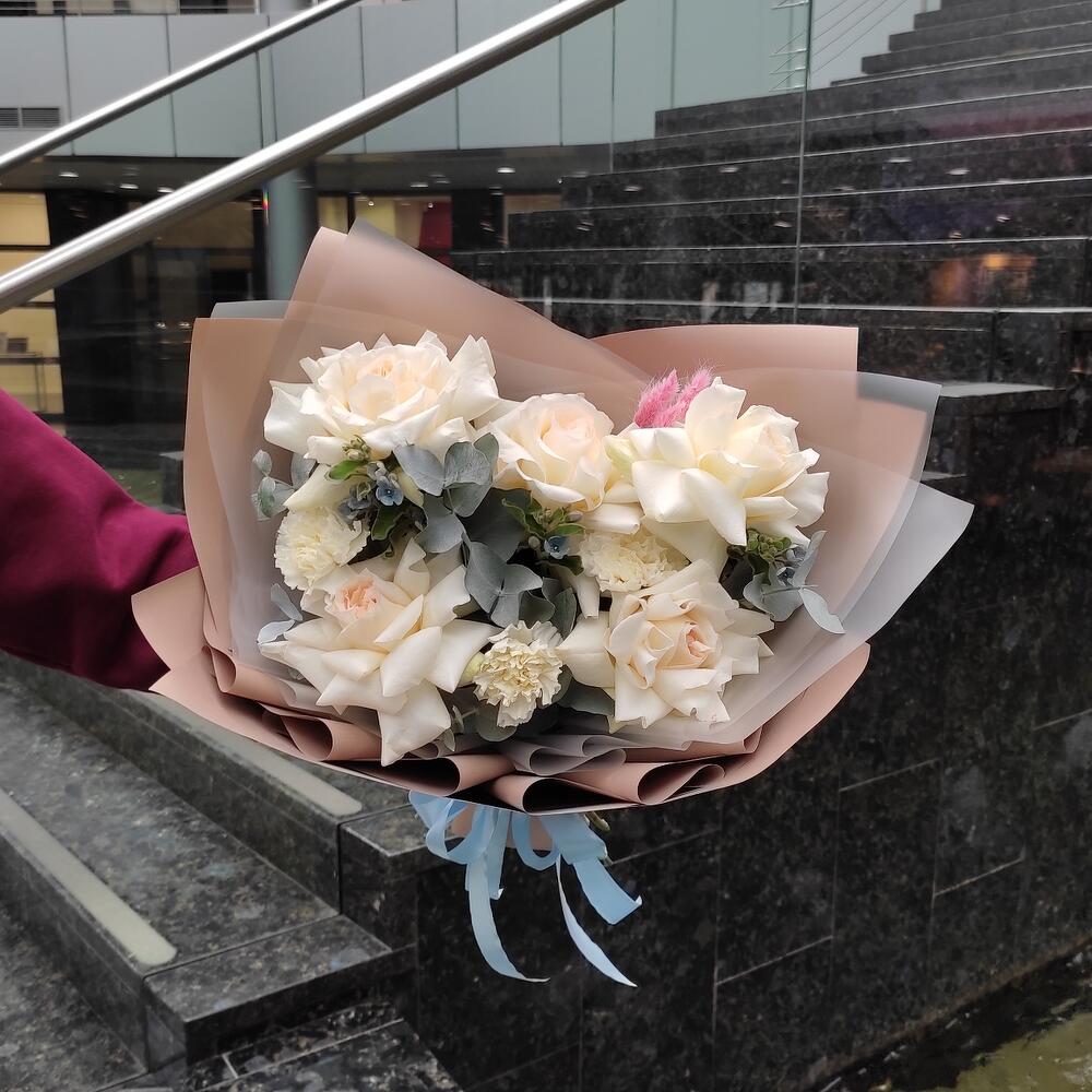 роза вайт о хара( ароматная) – 5 шт.оксипеталум голубой – 3 шт.Диантус белый – 3 шт.Эвкалипт – 1 шт.