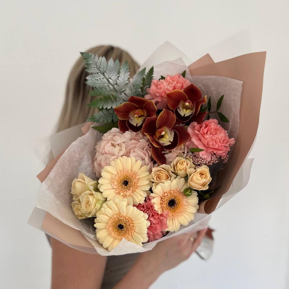 Гортензия – 1 шт.Озотамнус – 1 шт.Папоротник – 1 шт.Роза кустовая – 2 шт.Гербера – 3 шт.Диантус – 3 шт.орхидея – 3 шт.Дизайнерская упаковка – 3 шт.