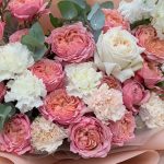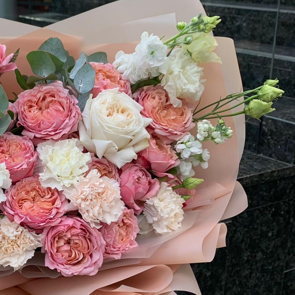 Букет из пионовидных роз гвоздики и матиолы Коралловый риф
