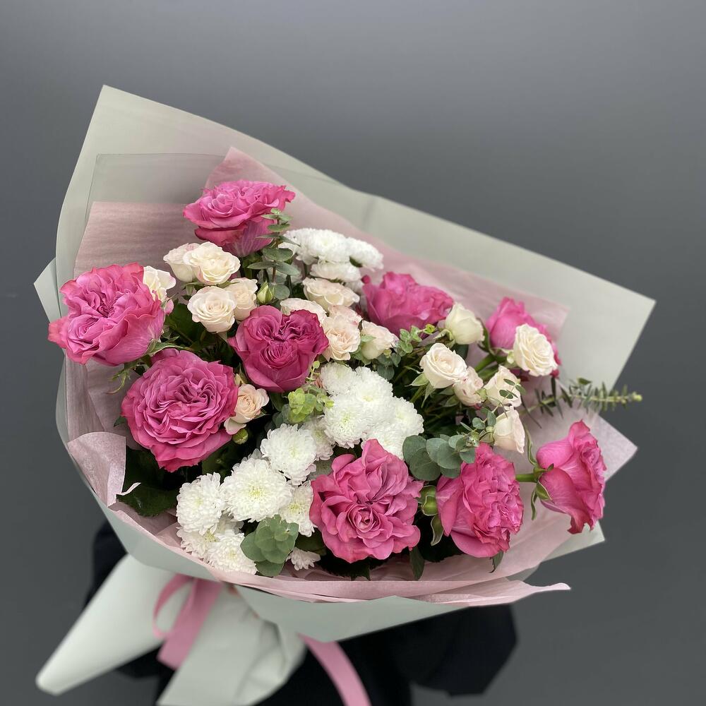Альстромерии, Гвоздики, Кустовые розы, Лизиантусы, Розы, Хризантемы