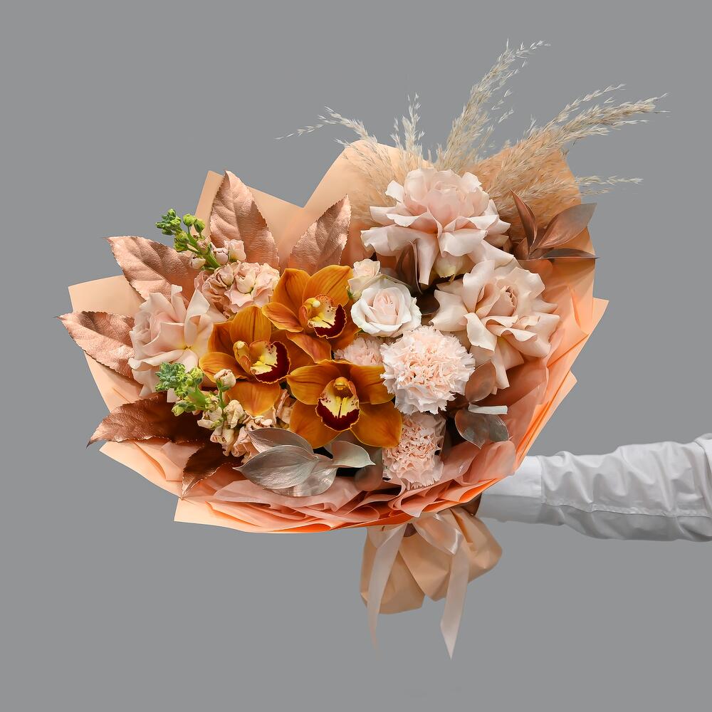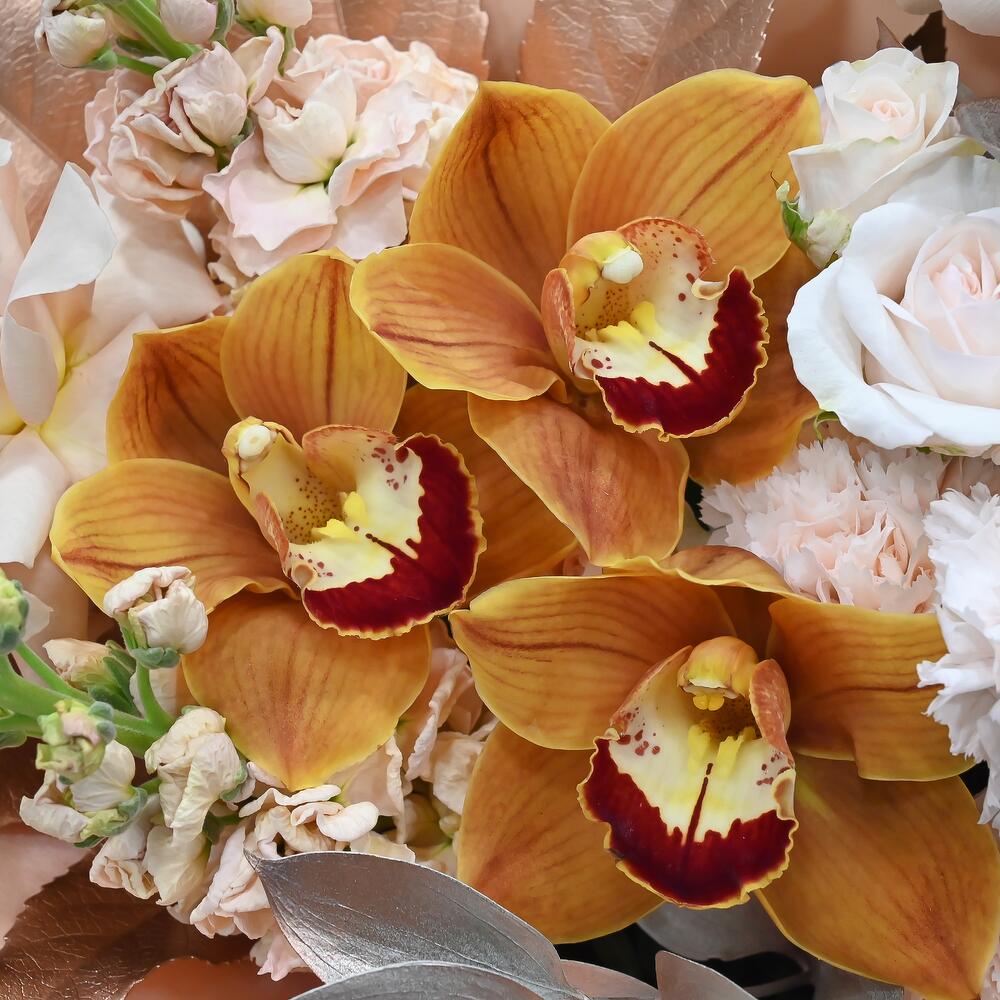 Французская роза – 3 шт.Кустовая роза – 1 шт.Гвоздика – 3 шт.Орхидея Цимбидиум – 3 шт.Аралия – 1 шт.Маттиола – 2 шт.Рускус – 5 шт.Упаковка дизайнерская – 1 шт.