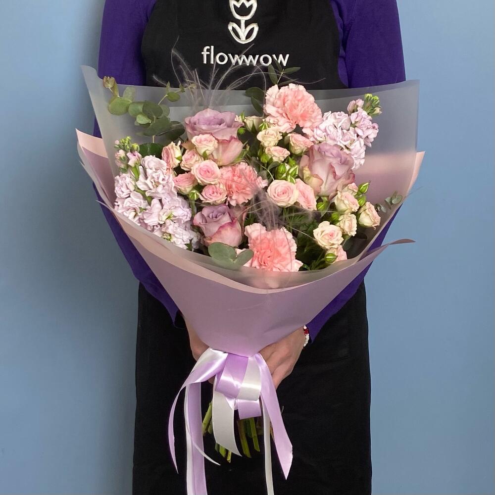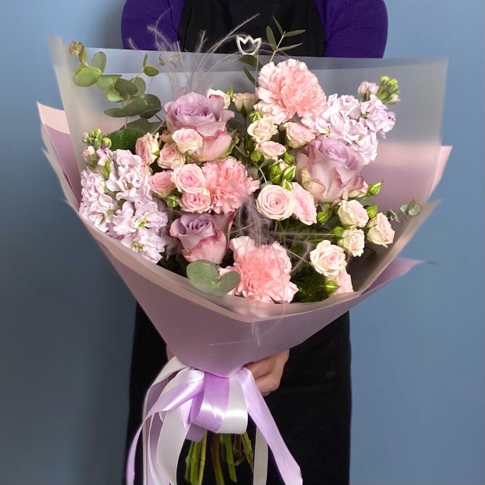 Роза сиреневая – 3 шт.Роза кустовая – 3 шт.маттиола сиреневая – 2 шт.Диантус розовый – 3 шт.Ковыль – 2 шт.Эвкалипт – 2 шт.Упаковка дизайнерская – 2 шт.Лента атласная – 2 шт.