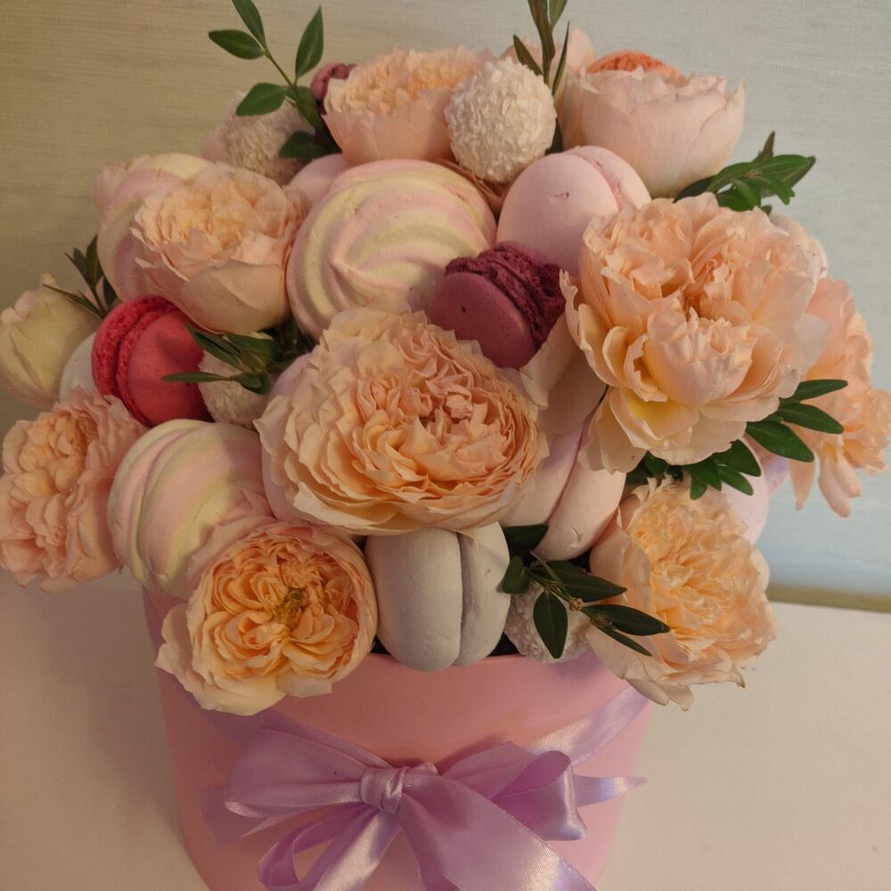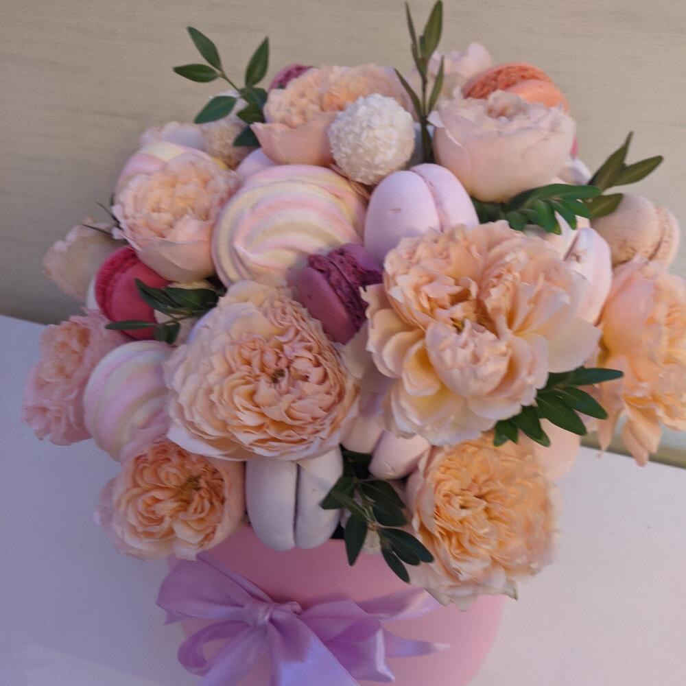 Роза кустовая – 5 шт.Раффаэлло – 8 шт.Коробка шляпная – 1 шт.зелень декоративная – 1 шт.зефир цветной – 500 гр.маккаруны – 10 шт.зефир розово желтый – 300 гр.