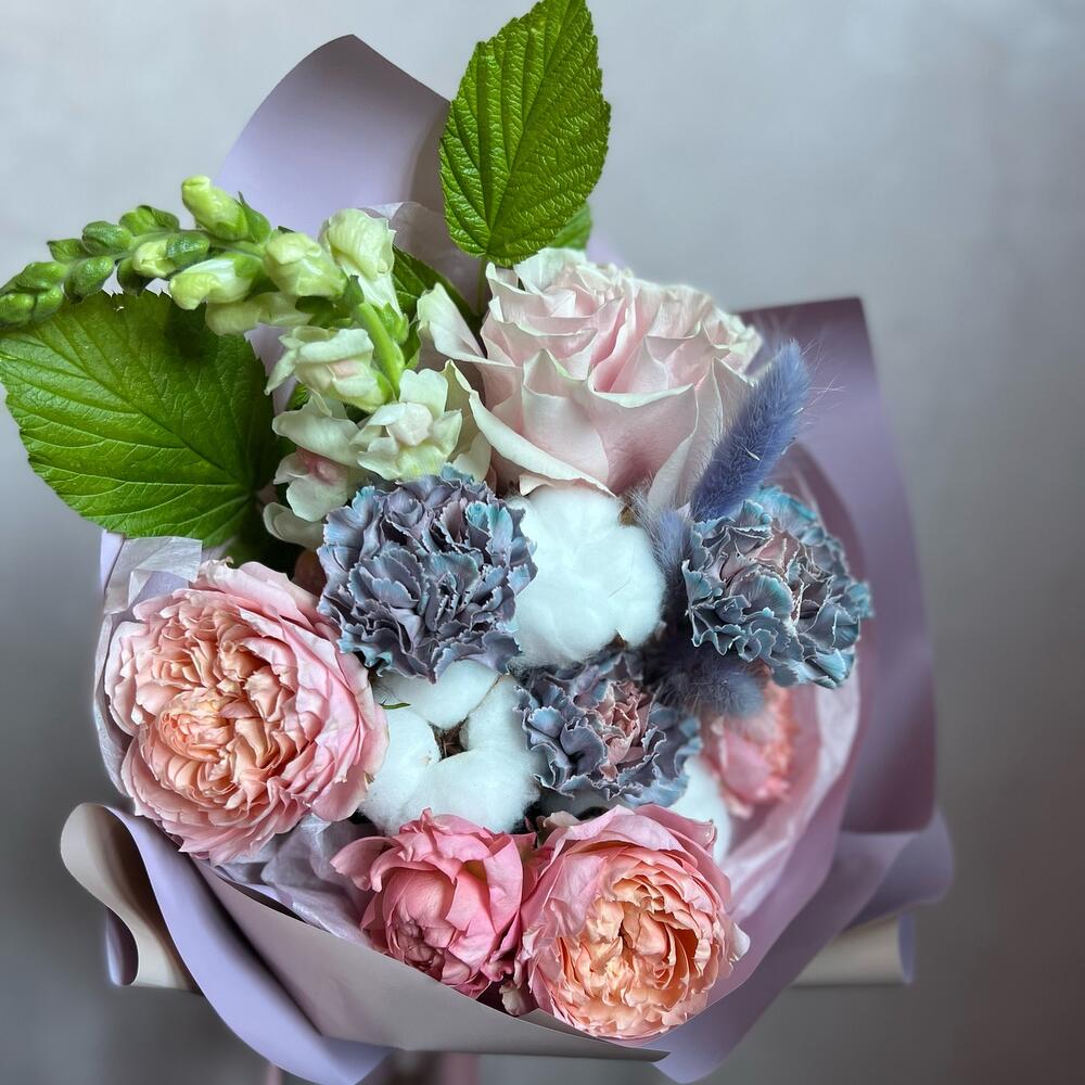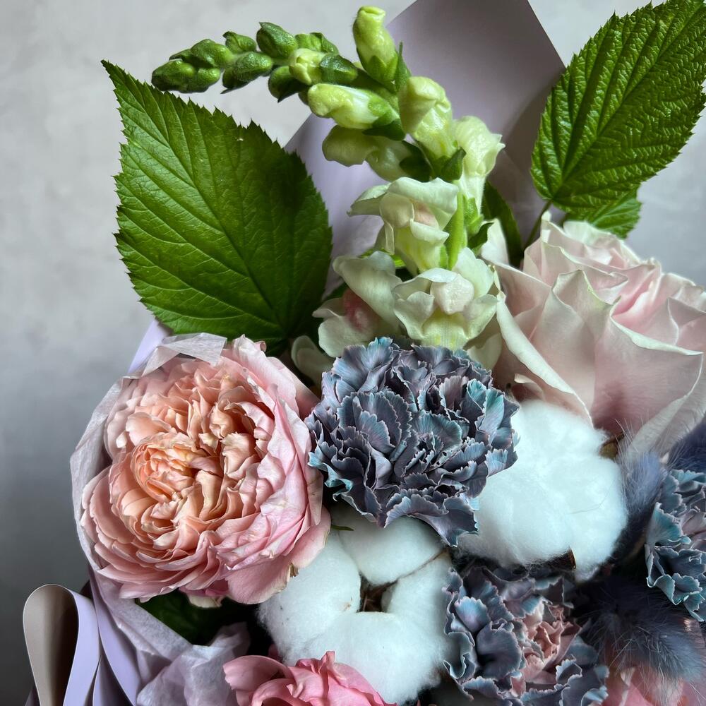 Одноголовая роза – 1 шт.Кустовая пионовидная роза – 1 шт.Антуриум – 1 шт.Гвоздика – 2 шт.зелень декоративная – 1 шт.Хлопок натуральный – 3 шт.Лагурус – 3 шт.декоративная упаковка – 1 шт.Атласная лента – 1 шт.