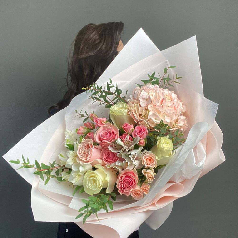 Альстромерии, Гортензии, Кустовые розы, Лизиантусы, Розы, Хризантемы