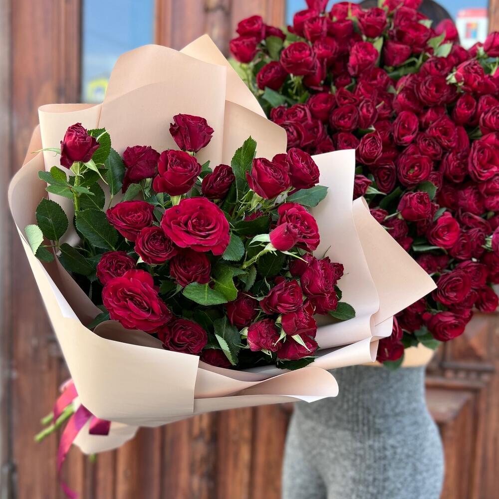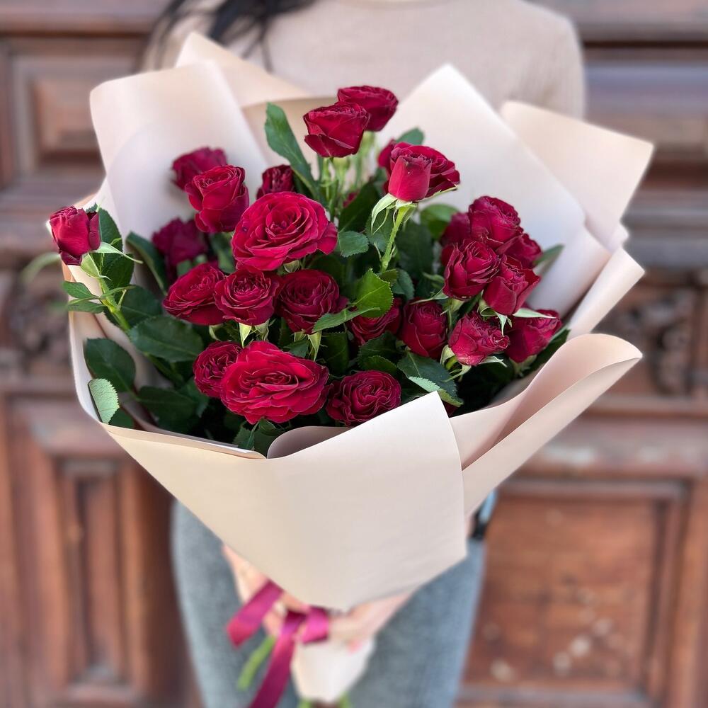 Лента атласная – 2 шт.Пленка матовая – 5 шт.роза кустовая ред трендсеттер – 5 шт.