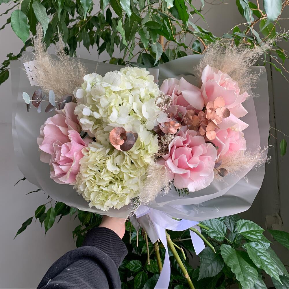 Озотамнус – 2 шт.Лента атласная – 1 шт.Гортензия белая – 2 шт.Упаковка дизайнерская – 1 шт.Кризал (подкормка) – 1 шт.Аквапак – 1 шт.Транспортировочная коробка – 1 шт.Роза pink mondial – 6 шт.инструкция по уходу за цветами – 1 шт.эвкалипт cineria пучок – 1 шт.сухоцвет пучок – 6 шт.
