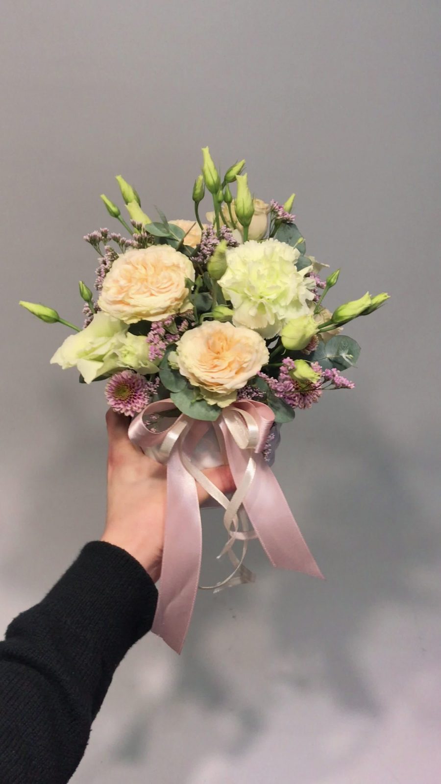 Кашпо керамическое – 1 шт.Оазис флористический – 1 шт.Роза кустовая пионовидная – 1 шт.Сантини – 1 шт.Лимониум – 1 шт.Гвоздика – 1 шт.Лизиантус – 1 шт.Эвкалипт – 1 шт.Лента – 1 шт.
