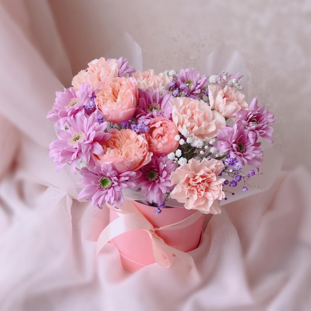 Гипсофила – 2 шт.Хризантема кустовая – 2 шт.Диантус – 5 шт.Шляпная коробка с лентой – 1 шт.Флористическая губка – 1 шт.Пионовидная роза джульетта – 1 шт.инструкция по уходу за цветами – 1 шт.