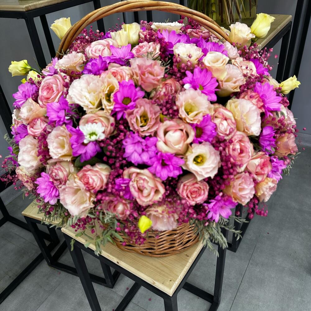 Роза – 29 шт. Хризантема – 33 шт. Эустома – 11 шт. Корзина плетеная – 1 шт. декоративная зелень – 5 шт.
