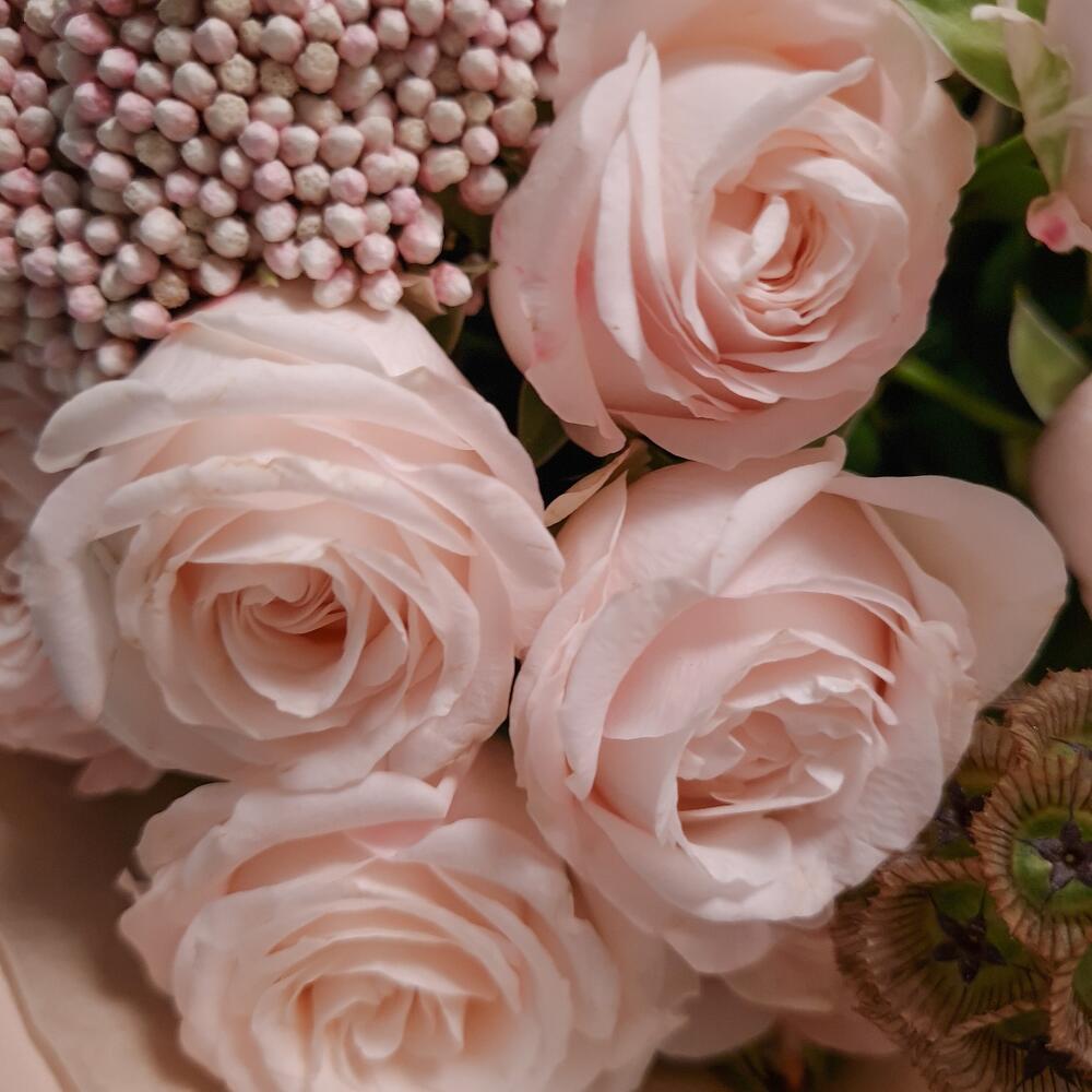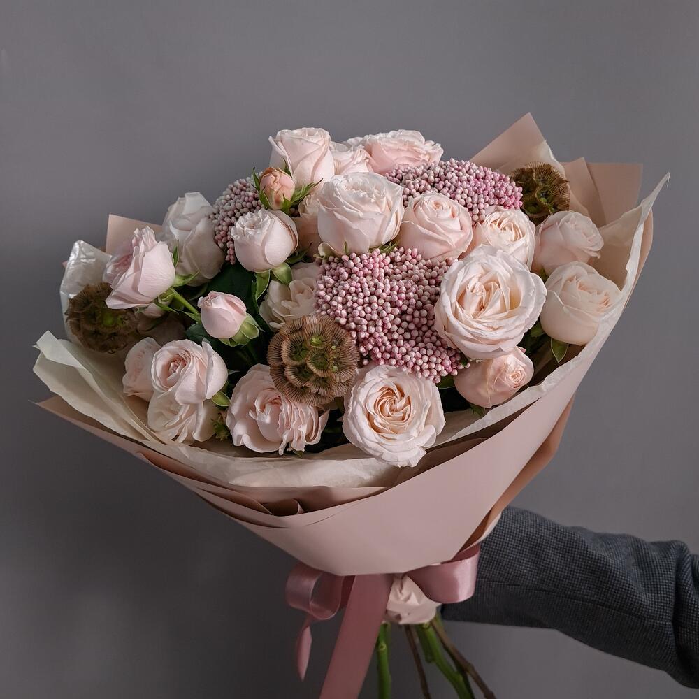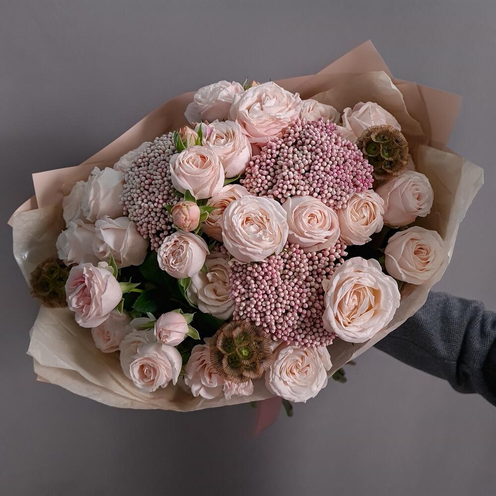 Озотамнус – 3 шт.Скабиоза – 3 шт.Аквапак – 1 шт.Роза кустовая пионовидная бомбастик – 7 шт.Дизайнерская упаковка – 1 шт.подкормка для срезанных цветов – 2 шт.