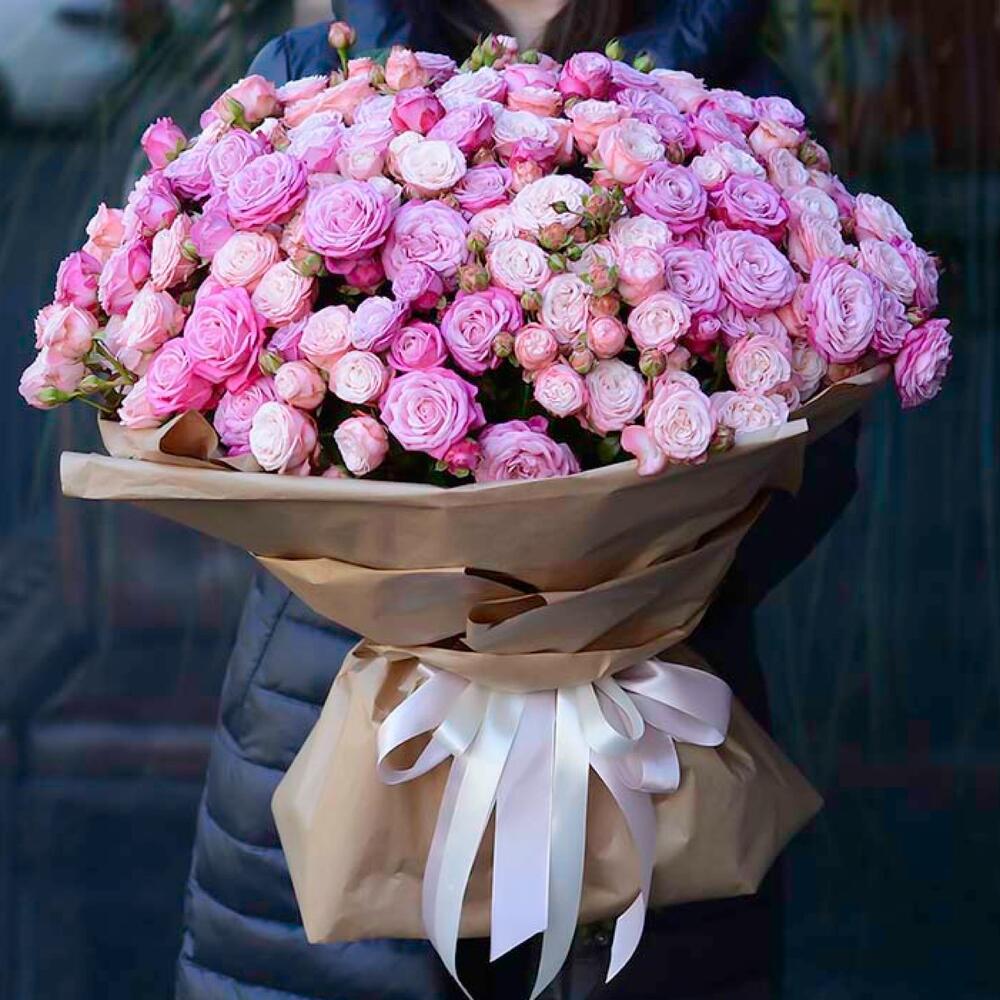 Пионовидная кустовая роза – 101 шт. Упаковка дизайнерская – 3 шт. Открыточка с вашими пожеланиями – 1 шт.