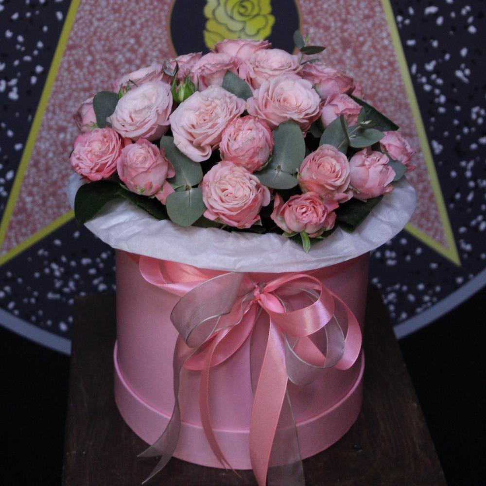 Роза кустовая пионовидная – 9 шт.Эвкалипт – 3 шт.Тишью – 2 шт.Оазис флористический – 1 шт.Шляпная коробка – 1 шт.Лента атласная – 2 шт.