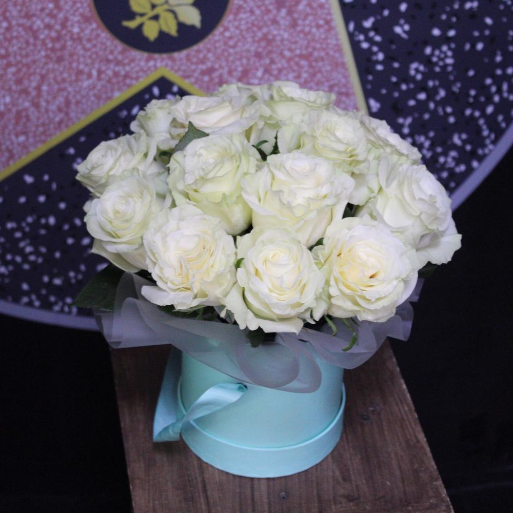 Роза Мондиаль – 15 шт.Пленка дизайнерская – 1 шт.Оазис флористический – 1 шт.Коробка шляпная – 1 шт.